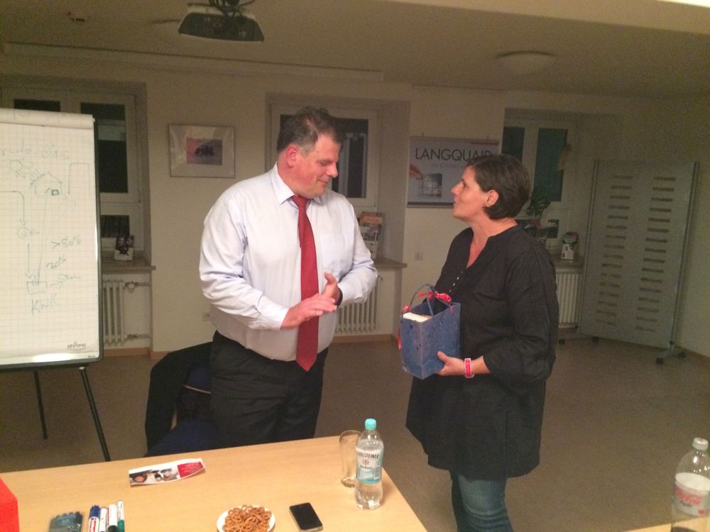 Ortsvereinsvorsitzende Kirsten Reiter überreicht Stephan Grüger ein Gastgeschenk