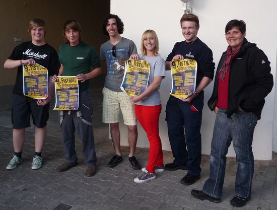 Die Vertreter der Bands mit den diesjährigen Plakaten besichtigen gemeinsam mit Kirsten Reiter (rechts) die Location Langquaid; Es gehört traditionell dazu, das erste Beschnuppern der Konkurrenz. Auch dieses Jahr trafen sich die Vertreter der Bands und die Organisatoren des SPD-Ortsvereins im Huberbräu zur Vorbesprechung des 9. Festivals für Nachwuchsbands. Dabei wurde die Reihenfolge der Auftritte ausgelost, die Nutzung des Equipments abgesprochen und es war Gelegenheit, die Location zu erkunden.